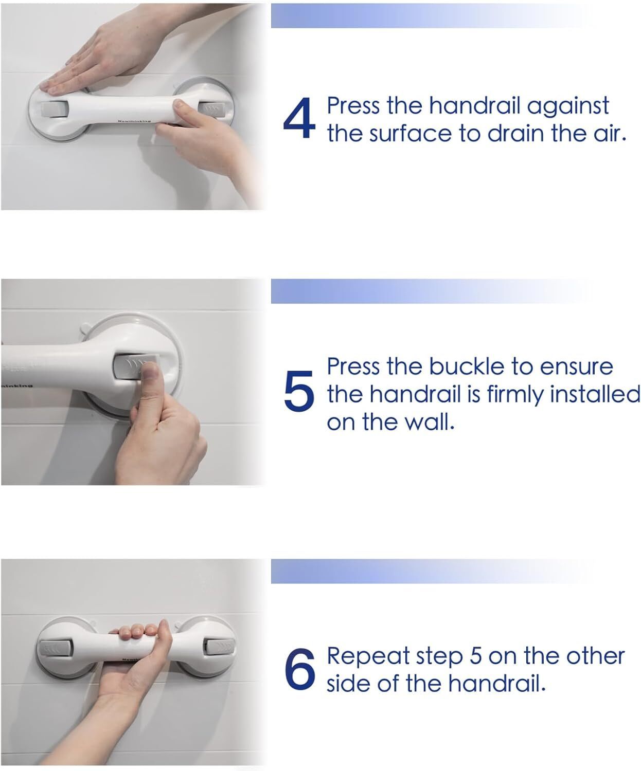 2 UK Our shower handle is attached in just a few simple steps: Simply lift the tab, position and close again. If necessary, it can be removed without leaving any residue without damaging the wall. Shower handle with suction cup has a slightly curved design that leaves you enough space to provide a safe and comfortable experience. This handle is not only suitable for bathrooms, but is also ideal as a grab bar for cabinets, windows and even fridge doors.