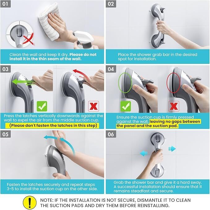 Shower handles should only be used on flat, non-porous, smooth, dry and clean surfaces. It cannot be installed via joints. This grab bar is only intended to support a person’s body and is not intended to support the weight of the entire body.