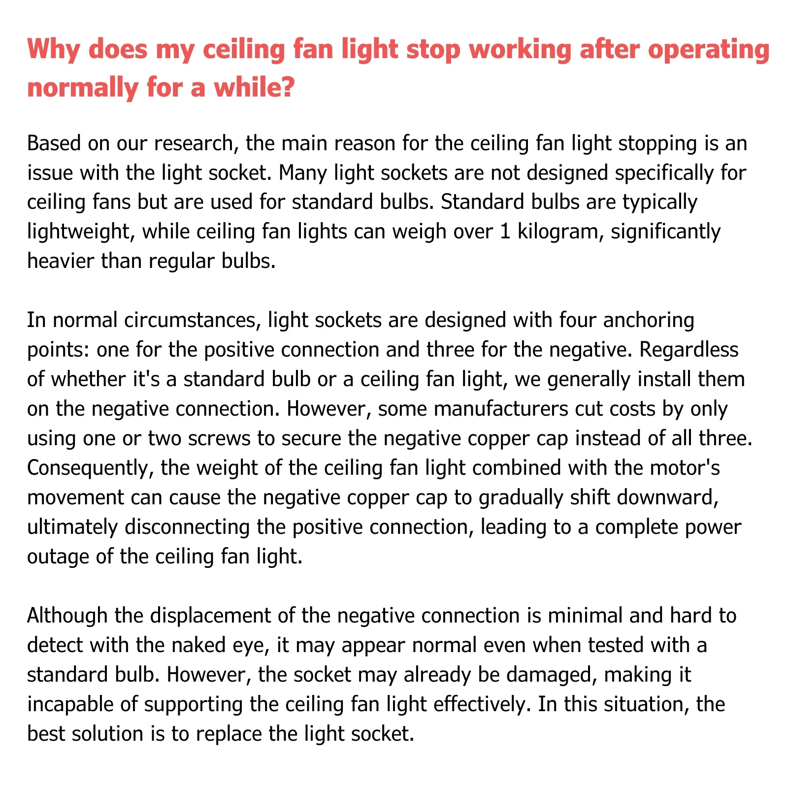 Additionally, for safety reasons, the fan light is equipped with a self-protection program. If the motor experiences excessive shaking, it will automatically prevent normal operation to safeguard against damage.