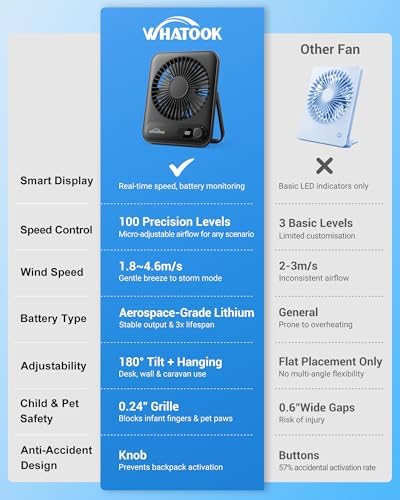 About this item Master Your Microclimate – Precision 1-100 Stepless Knob Control from breeze to full 5m/s storm mode* lets you dial in perfect airflow for any task (ideal for office concentration/relaxation). Smart Airflow Monitoring – Real-Time LCD Display* shows exact speed/power levels (never guess battery life again) Silent Productivity Partner – Office Approved: 30% quieter than standard desk fans, Ultra-quiet <28dB Brushless Copper Motor* ensures distraction-free work (quieter than typing sounds, ideal for open-plan workspaces). 10-Hour Focus Fuel – 2000mAh Battery* lasts through full workdays at low speed, Rapid 2.5H Quick Charge – Full power faster than lunch breaks using included Type-C cable. Space-Saving Genius Design – Slim 1.4 inch Profile (30% thinner than competitors) fits anywhere yet moves 30% more air than similar-sized fans (6.5 x 5.3 inch desk footprint). Ultra-Portable 225g* design weighs less than 2 apples (fits in laptop bags). Dual-Mode Versatility – Patented Convertible Stand* works horizontal or vertical (perfect for desks/shelves/travel) Finger-Proof Safety: WHATOOK Child-Safe Desk Fan with Ultra-Narrow Grille – 0.24″ ultra-compact grille design (60% narrower than standard) prevents tiny fingers from reaching blades, BS EN 60335-2-80 certified for UK nurseries. Decade Durability Promise – 5000+ Cycle Battery backed by 2 years warranty (lasts 3X longer than rivals) Smart Charge Guardian: AI-powered charging system prevents 93% of battery degradation causes – Achieves 500 full cycles with 80% capacity retention (vs industry average 300 cycles). Zero-Compromise Eco Power: 2.8W ultra-low consumption (65% less than standard fans) saving £10/year and 100% recyclable packaging – Carbon Trust & Energy Saving Trust.
